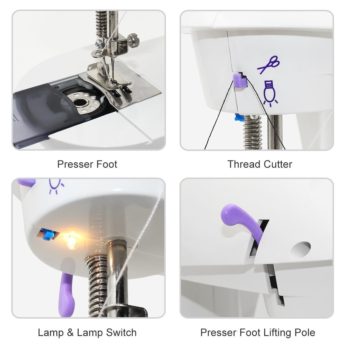 SWEET DESIGNS FOR YOU: The mini size are well designed for sleeves and legs’ sewing. The thread cutter and lamp help you do sewing works more convenient. The thread spindle help you winding the thread
